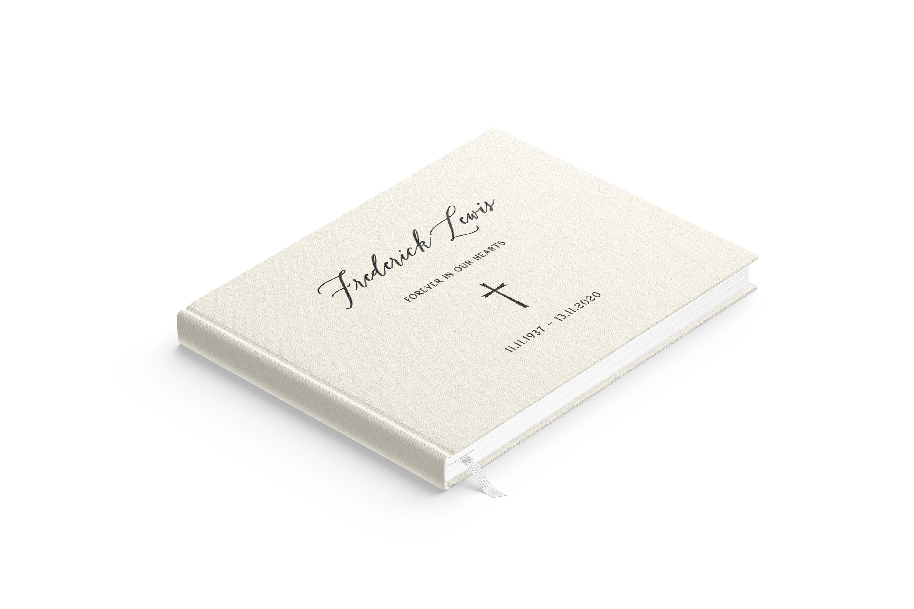 Hardcover bound with a luxurious textural linen finish and a white ribbon bookmark