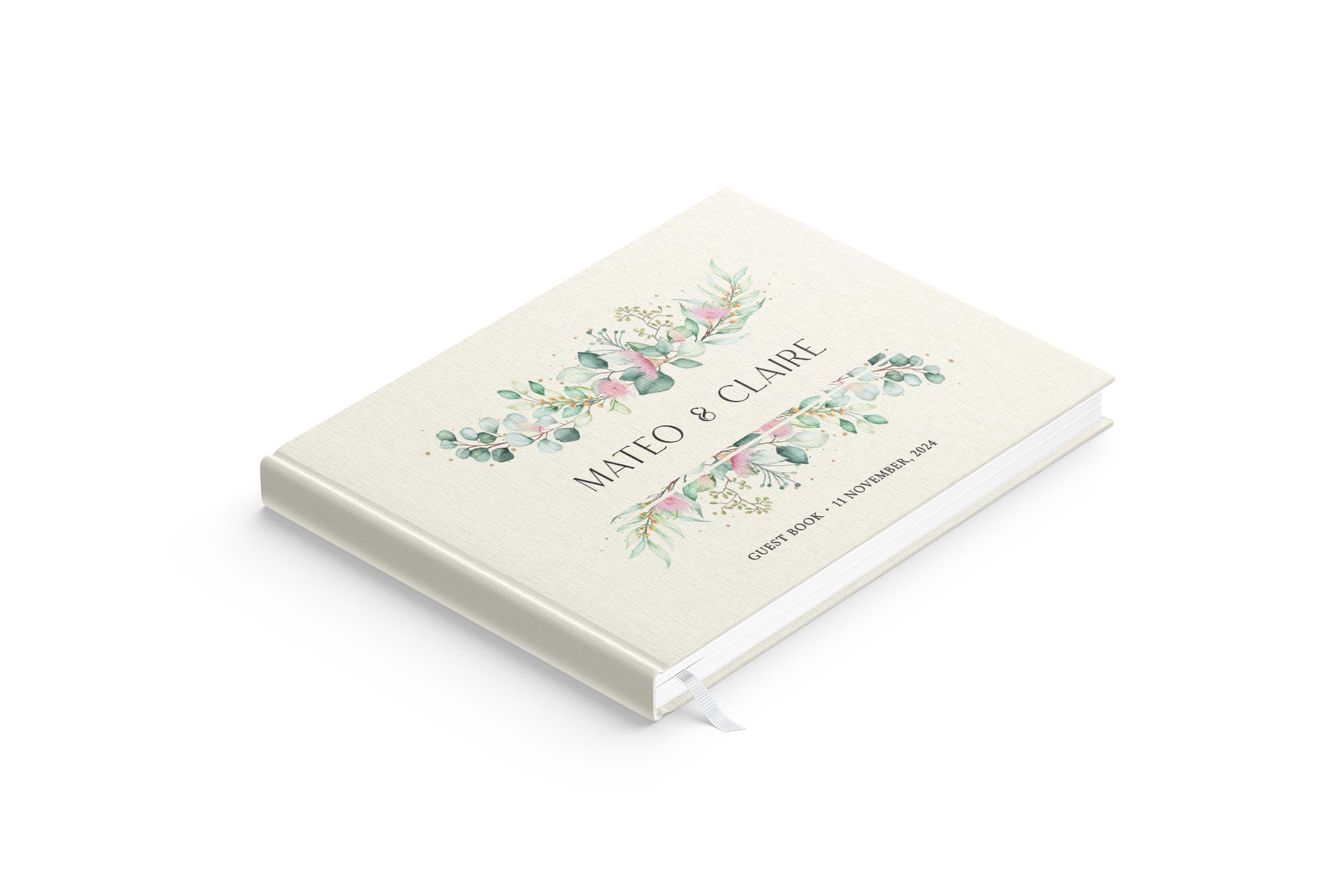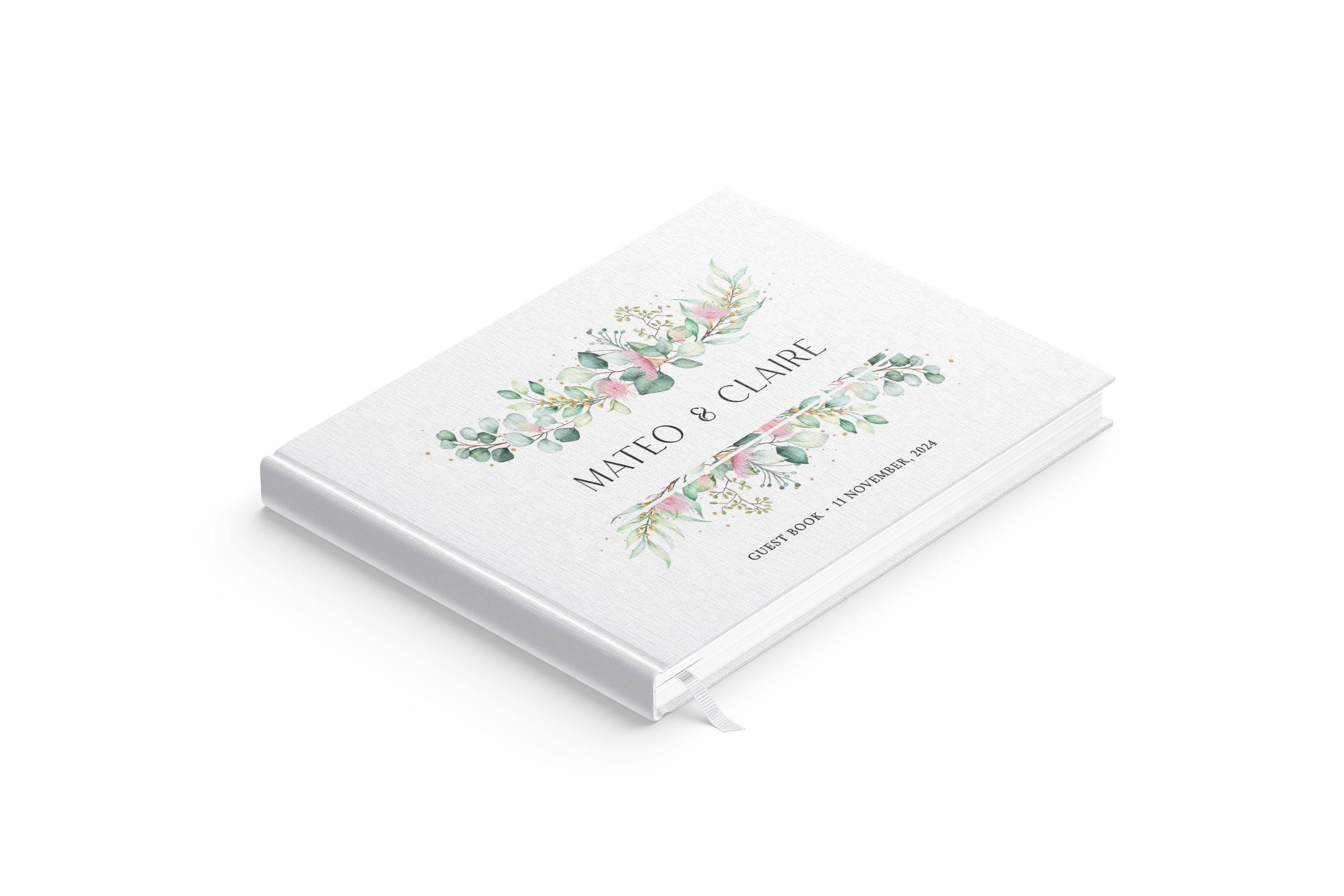 Hardcover bound with a luxurious textural linen finish and a white ribbon bookmark